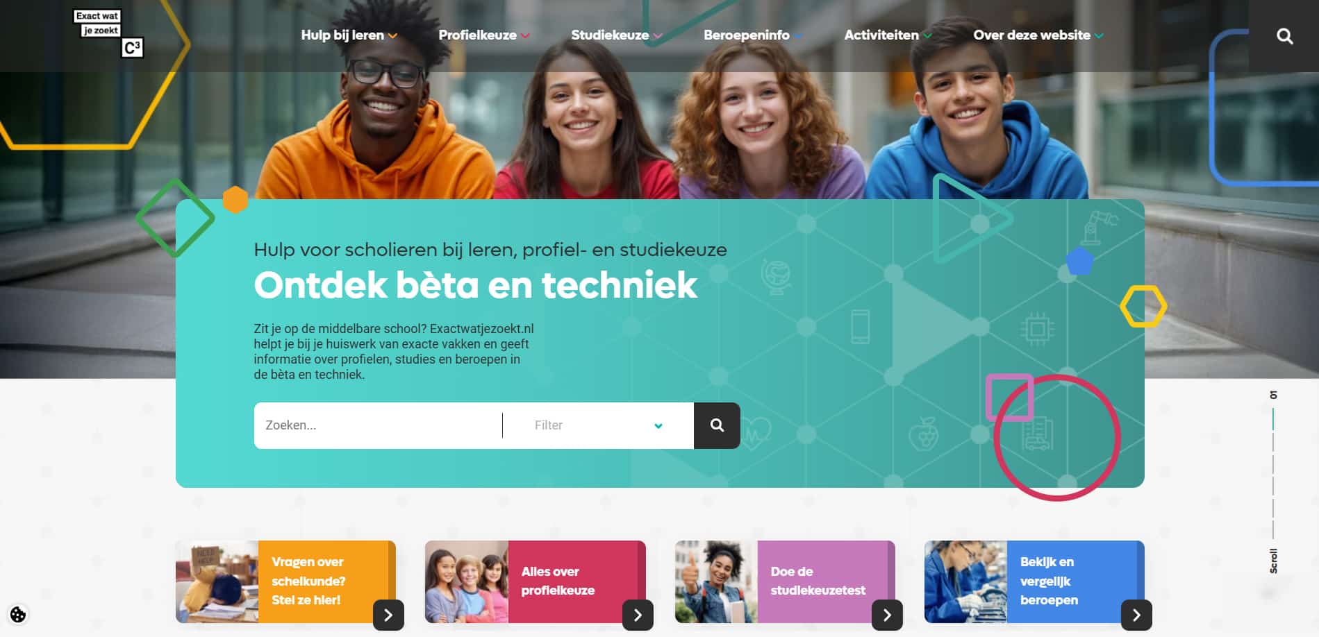 Het scholierenplatform exactwatjezoekt.nl is een initiatief van C3 en wil jongeren in aanraking brengen met de wereld van wetenschap en technologie en ze helpen bij hun bètavakken. Dat moet de scholieren niet alleen meer zelfvertrouwen, identificatie en kennis opleveren maar bovenal een ruimere blik om bewuste keuzes voor de toekomst te maken. Het nieuwe oefenmateriaal draagt hieraan bij.